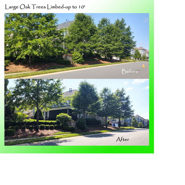 The natural growth habit of a tree outside it's natural habitat, say, in a forest, is much different as opposed to a tree growing in an open front yard in full sun. When trees are planted in an open area like a front yard with full sun, the lower branches get more sunlight and branches will grow outward and lower. As branches grow lower, they can hide your home, prevent mowing, and the tree can become an eyesore. We come in and remove those lower branches, making the cut close the the trunk of the tree to allow the bark to heal over before the inside of the wound rots out. If a branch or stub is left from a branch pruned near the trunk of a tree, it can bring in disease, cause rot, and destroy the structural integrity of your tree.